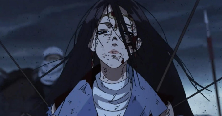 披在肩上的发辫缀着质感满满的兽骨饰件,眉骨上一抹利落的彩绘自带西域野性,蓝袍裹着三层牛皮甲。