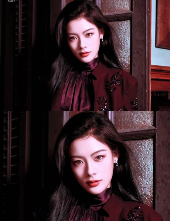 红唇是点睛之笔,冷白皮衬得红唇愈发鲜亮,笑起来时眼尾微微上扬,既有东方美人的温婉,又带着一丝锐利的灵气。