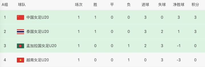 同组首轮另外一场比赛,泰国队3-2险胜孟加拉国队。首轮战罢,中国女足与人泰国女足王人是同积3分,但中国女足凭借净胜球上风在本组暂列头名。