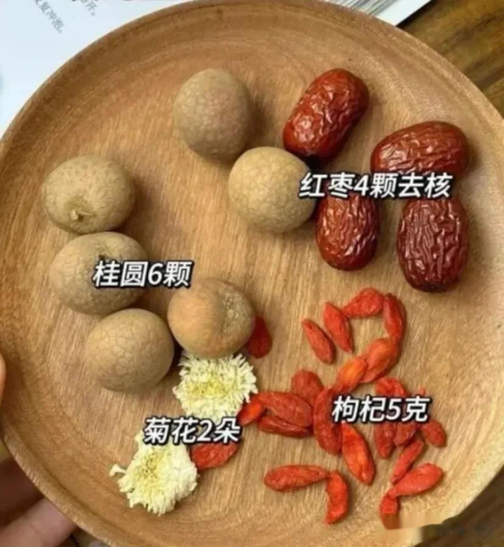 带壳干桂圆8-10颗、红枣3-4颗、菊花2-3朵(可选,怕上火加)、枸杞少量、净水1000ml