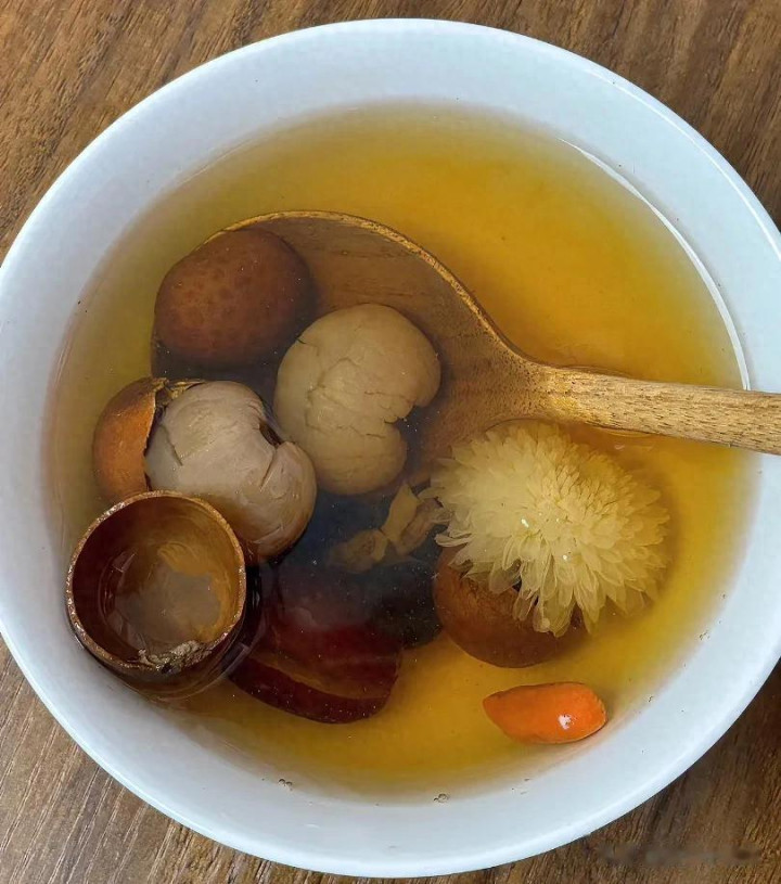 • 怕上火的一又友不错加1-2朵菊花,中庸桂圆的温性,平常喝更温煦。