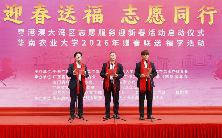 1月20日,“迎春送福,志愿同行”粤港澳大湾区志愿服务迎新春暨华南农业大学2026年赠春联送福字活动在华农行政楼广场举行,书法名家、粤港澳三地志愿服务代表及华农师生齐聚一堂,以志愿之名传温暖,以笔墨书香迎佳节,共同奏响大湾区志愿服务协同发展的新春序曲。