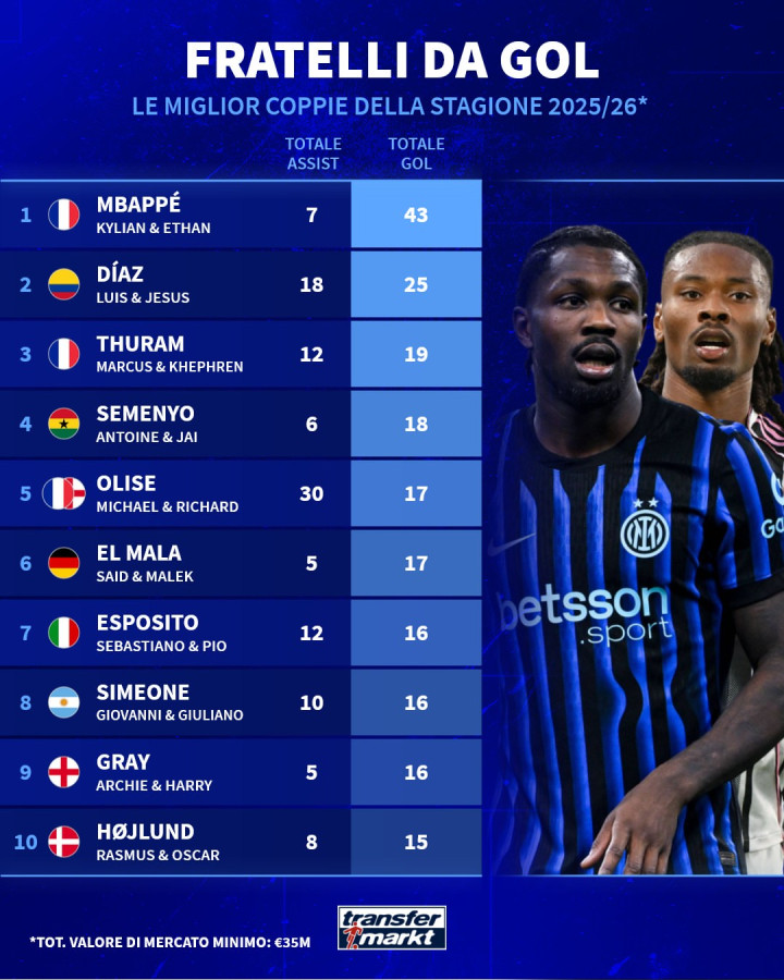虎扑04月15日讯德转近日清点了2025/26赛季足坛“兄弟连线”数据,统计了本赛季兄弟组合在俱乐部和国度队层面的助攻与进球弘扬。成果显现,姆巴佩兄弟高居榜首,基利安与伊桑悉数一经送出7次助攻、打进43球,成为本赛季火力最猛的兄弟组合。