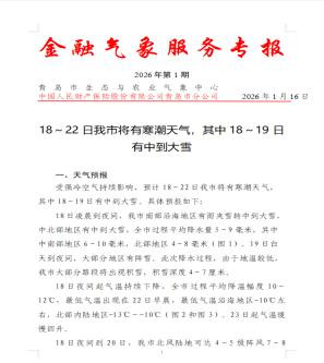 依托与青岛市气象局的合作机制,密切关注天气变化,实现分区域精准灾害预警;与青岛市生态与农业气象中心联合发布金融气息服务专报,定点推送给客户及相关农业、企业大户;多渠道第一时间向社会公众发布气象预警及安全提示,提醒广大群众提前做好防范,切实应对此次寒潮雨雪天气。