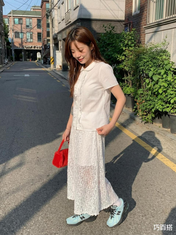 也不错选拔粉色+白色、蓝色+白色交相衬映的半身裙,这种情况下即使是高足够度的彩色,春夏天际穿外出也不会突兀,充任稀释剂作用的白色,成了点睛之笔,任何年岁、任何肤色、任何场面皆能幽闲鉴戒。