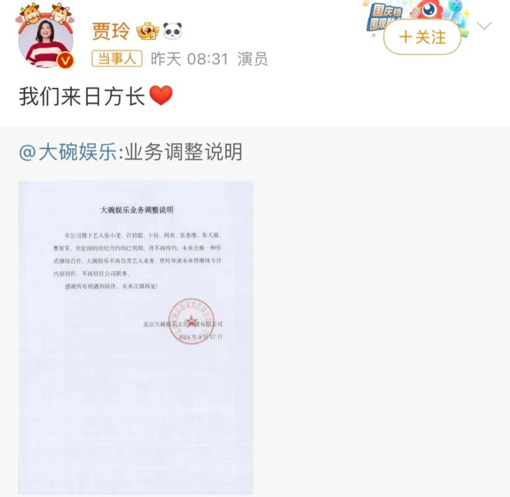 2024年9月,大碗娱乐艺人何欢在社交平台发了公司业务调整的图片,随后大碗娱乐发公告:贾玲不再担任公司职务,旗下艺人合约到期后不再续约。