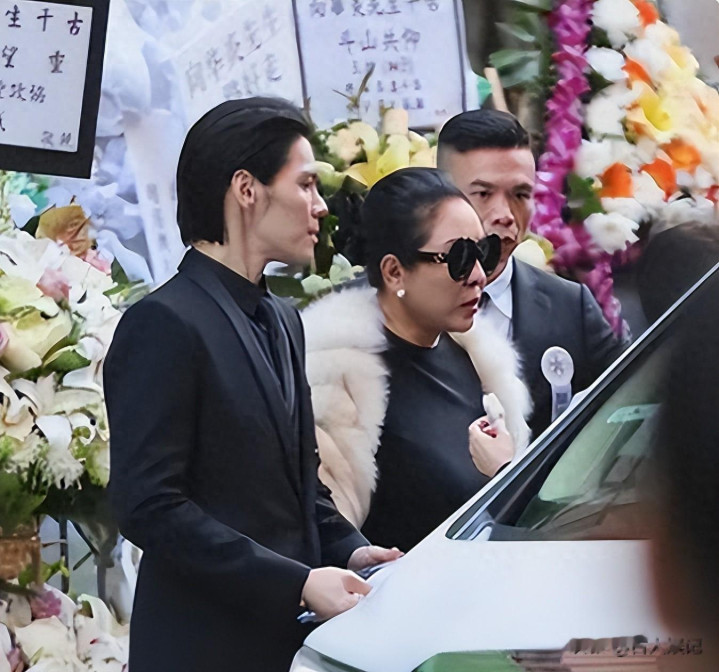 向太陈岚穿着黑色上衣,配上白色貂皮大衣,戴着墨镜,搀扶着向华强,两人快步走进殡仪馆。