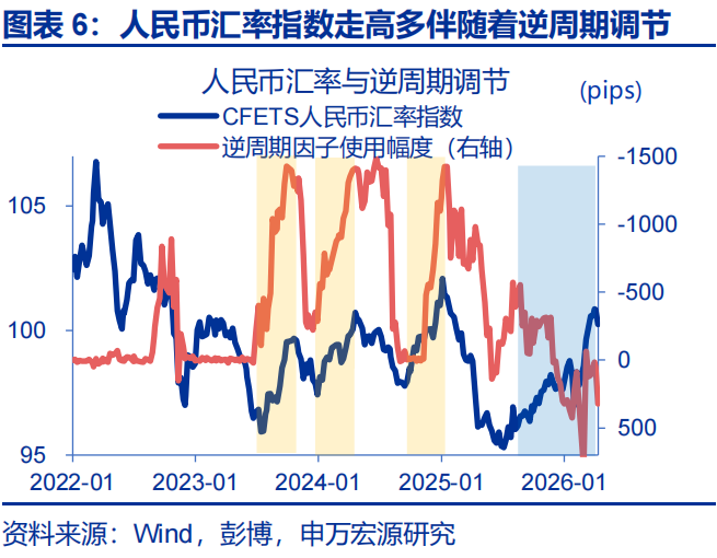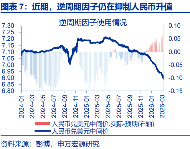 这是“811”汇改以来,东谈主民币第二次演出与好意思元的双强面目;同期,逆周期因子扼制增值配景下东谈主民币兑一篮子货币的走强,也较为荒僻。一方面,2015年“811”汇改以来,东谈主民币兑好意思元走强多发生在好意思元颓势或震憾的面目中,与好意思元演绎双强面目仅在2021年7月至2022年2月出现过1。另一方面,2022年以来,东谈主民币兑一篮子货币曾屡次走强,但王人是受逆周期转化的作用;彼时好意思元快速增值,央行逆周期转化随意了东谈主民币贬值压力、使得东谈主民币兑一篮子货币相对偏强。但3月以来东谈主民币逆周期因子使用幅度约126pips,反而在扼制东谈主民币增值。