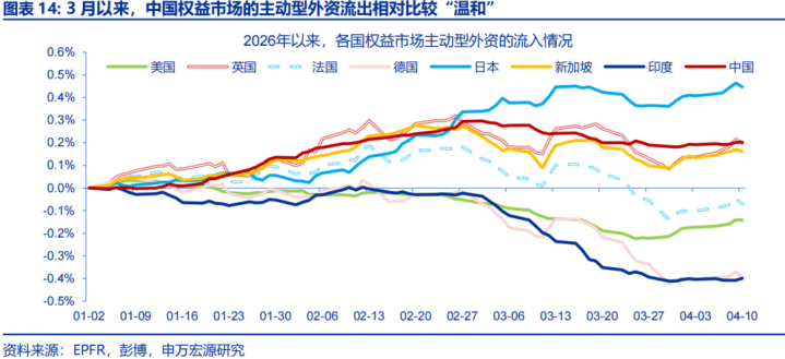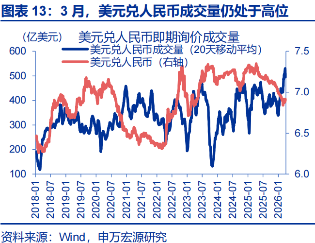 第二,资金面视角,“结汇潮”仍在延续,而职权商场的主动型外资也并未在避险神气下大幅外流。一方面,2月银行代客结售汇顺差仍高达551.9亿好意思元,净结汇范畴虽在季节性结汇退坡后有所回落,但单月结售汇顺差范畴依然本轮结汇潮以外的历史次高、仅次于2020年12月年驱逐汇岑岭中的652.2亿好意思元。从好意思元兑东谈主民币即期询价成交量的高频数据来看,3月结汇或仍维系了较高的强度。另一方面,在中东浮松爆发后,职权商场的主动型外资快速撤出好意思欧商场,但中国商场的主动型资金外流则相对精真金不怕火、仅在3月中旬出现小幅流出。
