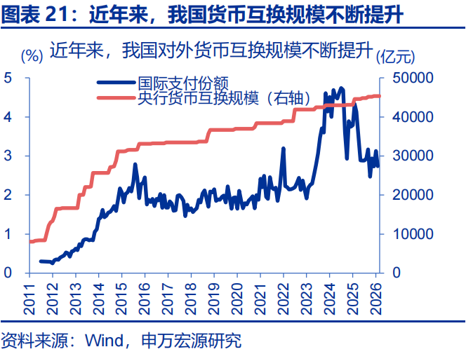 第二,地缘浮松与金融制裁或正重塑民众结算安全明白,并通过收缩石油好意思元体系的把持、抬升东谈主民币在动力生意中的结算占比,成为复旧东谈主民币汇率的蹙迫力量。中东变局后,列国或将对“以单一货币计价、经单一清理体绑缚算”的安全性更趋审慎,动力生意或将更爱好结算的可替代性。频年来,我国跨境生意中东谈主民币使用占比一度升至35%,对应的、我国央行的货币互换范畴也已扩大至4.5万亿元,面前已与沙特、阿联酋、卡塔尔等主要产油国诞生互换安排。这意味着,后续石油好意思元体系的角落松动,正为东谈主民币扩大计价、结算与储备功能的使用范围翻开空间。