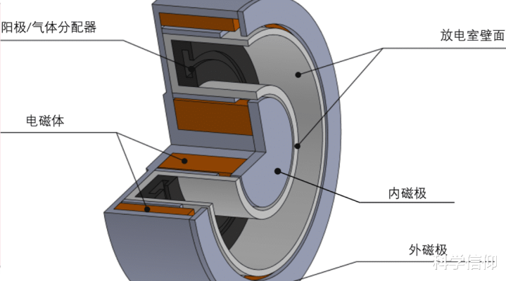 霍尔鼓励器的里面构造其实很浅显,它由两个一侧闭塞、一侧启齿的齐心圆柱构成,在两个圆柱的中间是一个放电通谈,用于向后喷射离子。