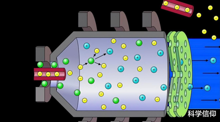 离子在喷出的经由中会与电子发生中庸,造成电中庸的废气,这些喷出的废气就会反向推动航天器上前通顺。